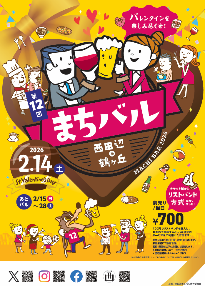 2026年1月14日 / 最終更新日時 : 2026年1月14日 nishitanabe 新着情報 第12回まちバル開催!バレンタインを楽しみつくせ! 今年もバルの季節がやってきました!2026年2月14日バレンタインに第12回まちバルを開催!! ※クリックorタップでPDFが開きます コメントを残す コメントをキャンセルメールアドレスが公開されることはありません。 * が付いている欄は必須項目ですコメント * 名前 * メール * サイト 次回のコメントで使用するためブラウザーに自分の名前、メールアドレス、サイトを保存する。