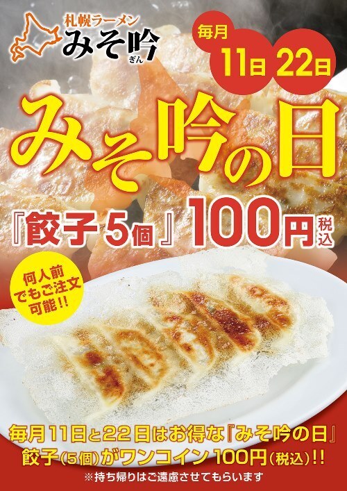 毎月11日・22日は【みそ吟の日】餃子が100円!